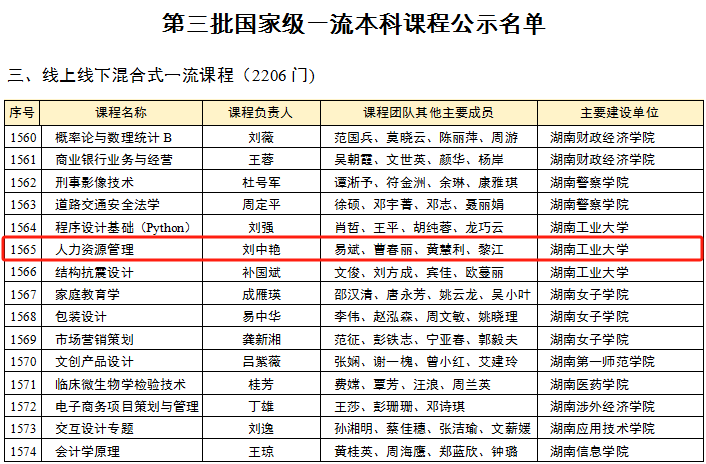 近日,教育部公示了第三批国家级一流本科课程认定结果,我院刘中艳教授主持申报的《人力资源管理》课程拟认定为国家级线上线下混合式一流课程。这是自2023年《会计学原理》首获国家级一流本科课程认定以来,我院在本科课程建设方面取得的又一重要成果,标志着学院本科教育教学改革持续深化、建设成效日益显著。