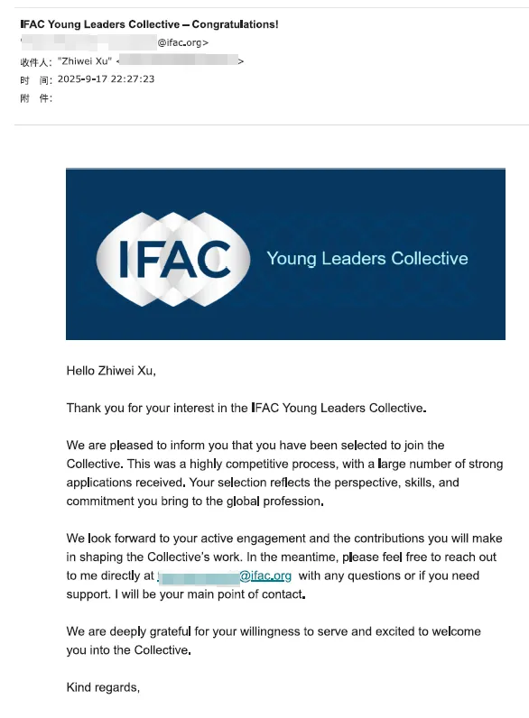 近日,从全球会计行业最具权威性的组织——国际会计师联合会(IFAC)传来振奋人心的消息:我校经济与管理学院2022级会计学专业本科生徐志伟成功入选2026年度IFAC青年领袖联盟成员,成为本年度中国区唯一入选者,跻身全球未来财经领袖之列。这一突破性成就,标志着我校在高素质财经人才培养方面的实力与影响力,标志着我校育人质量正加速与国际高标准接轨。